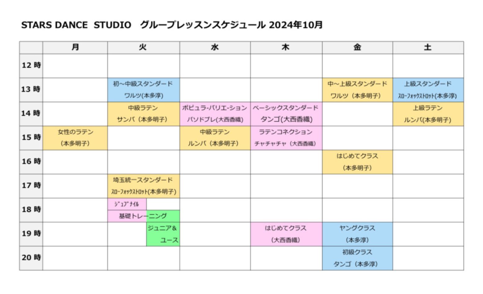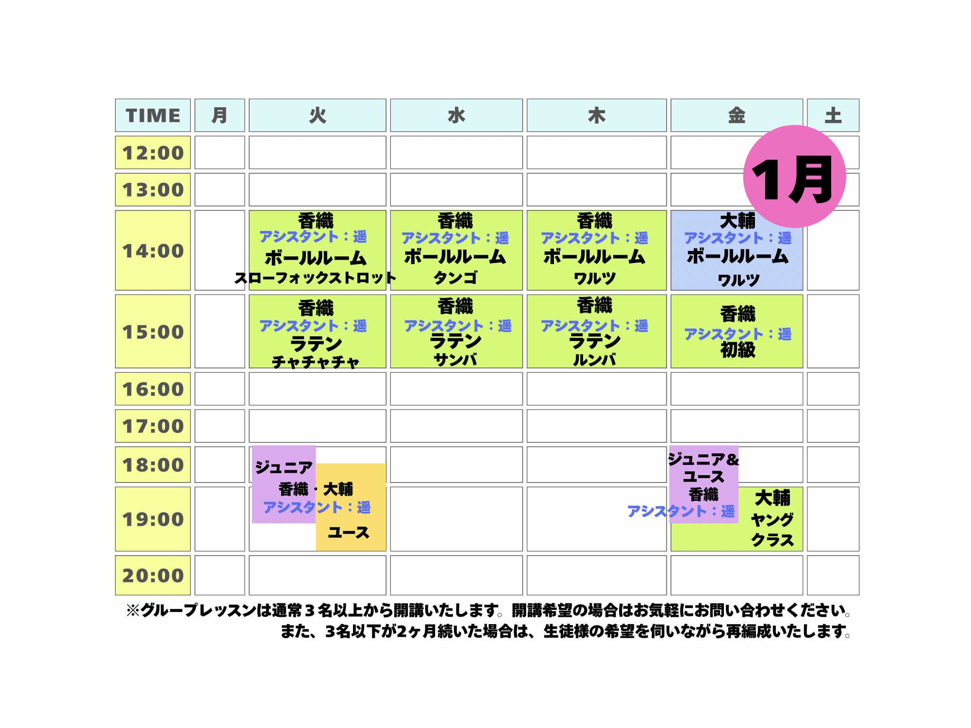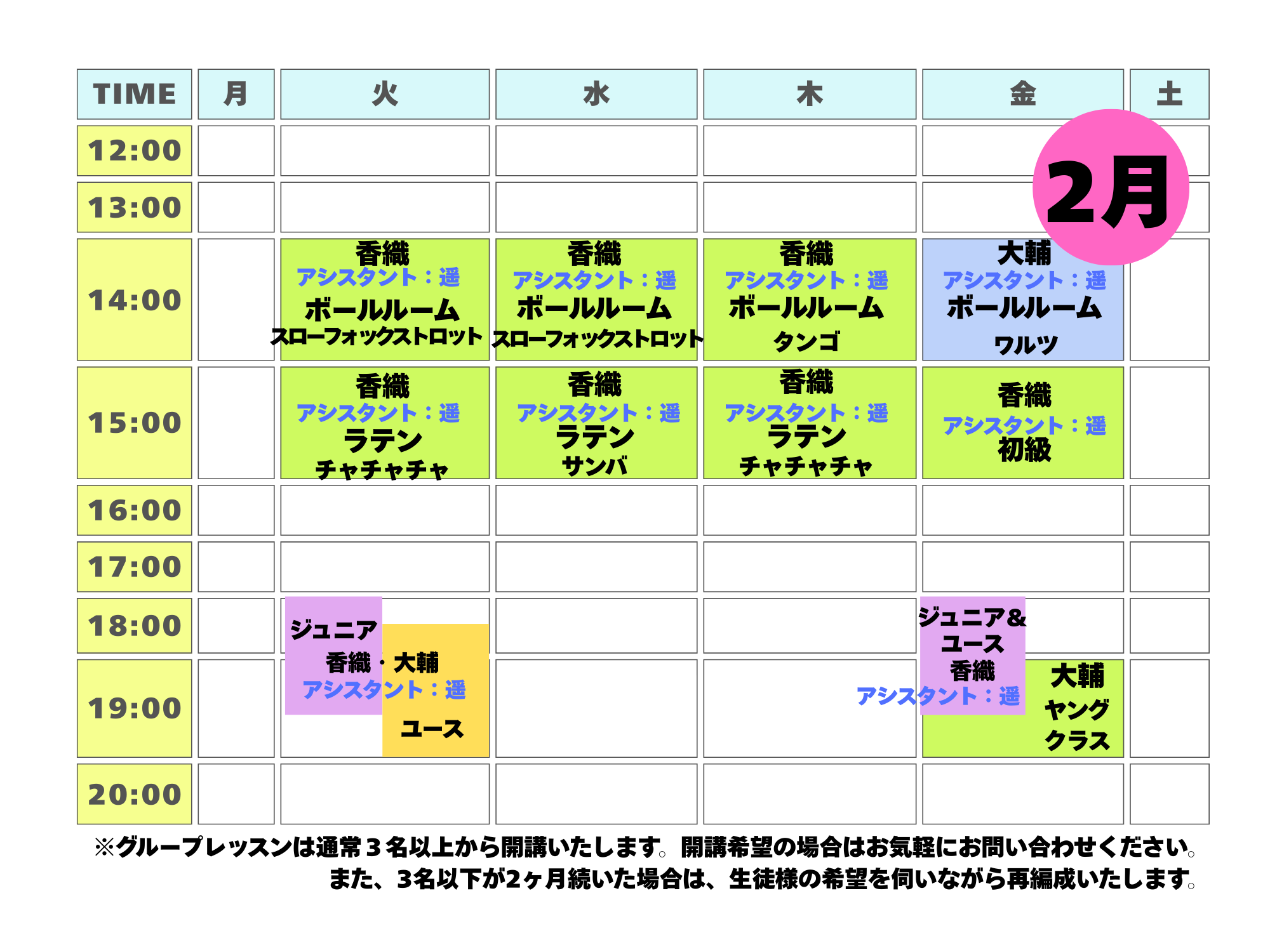 | プライベートレッスン カップルレッスン | 講師:大西大輔・大西香織 25分4,800円(税込) 50分8,700円(税込) レッスン時間が自由に選べる予約制です。自分のやりたい事を自分のペースで学べます。グループレッスンと並行して活用するのもオススメです。料金はレッスン毎に現金にてお支払いください。 |