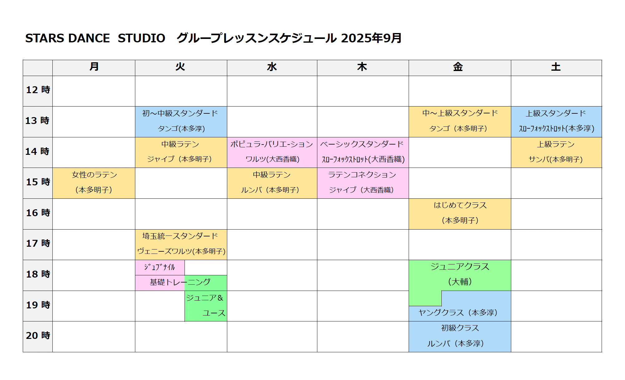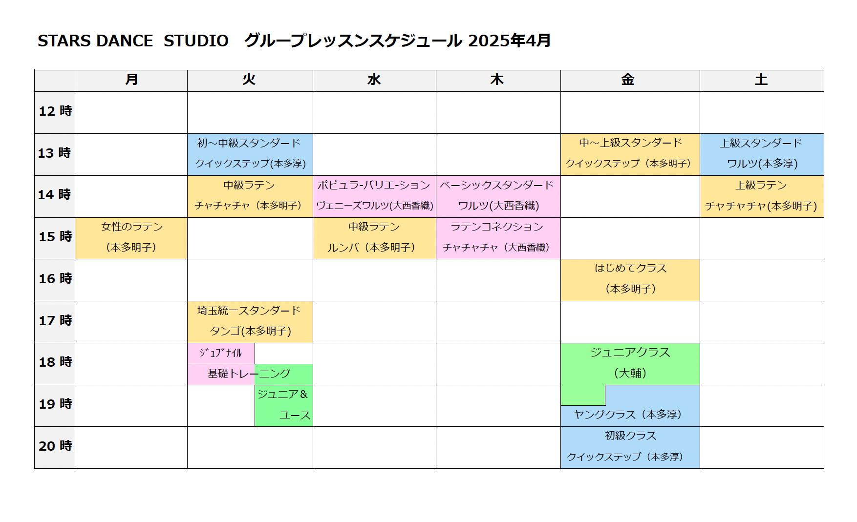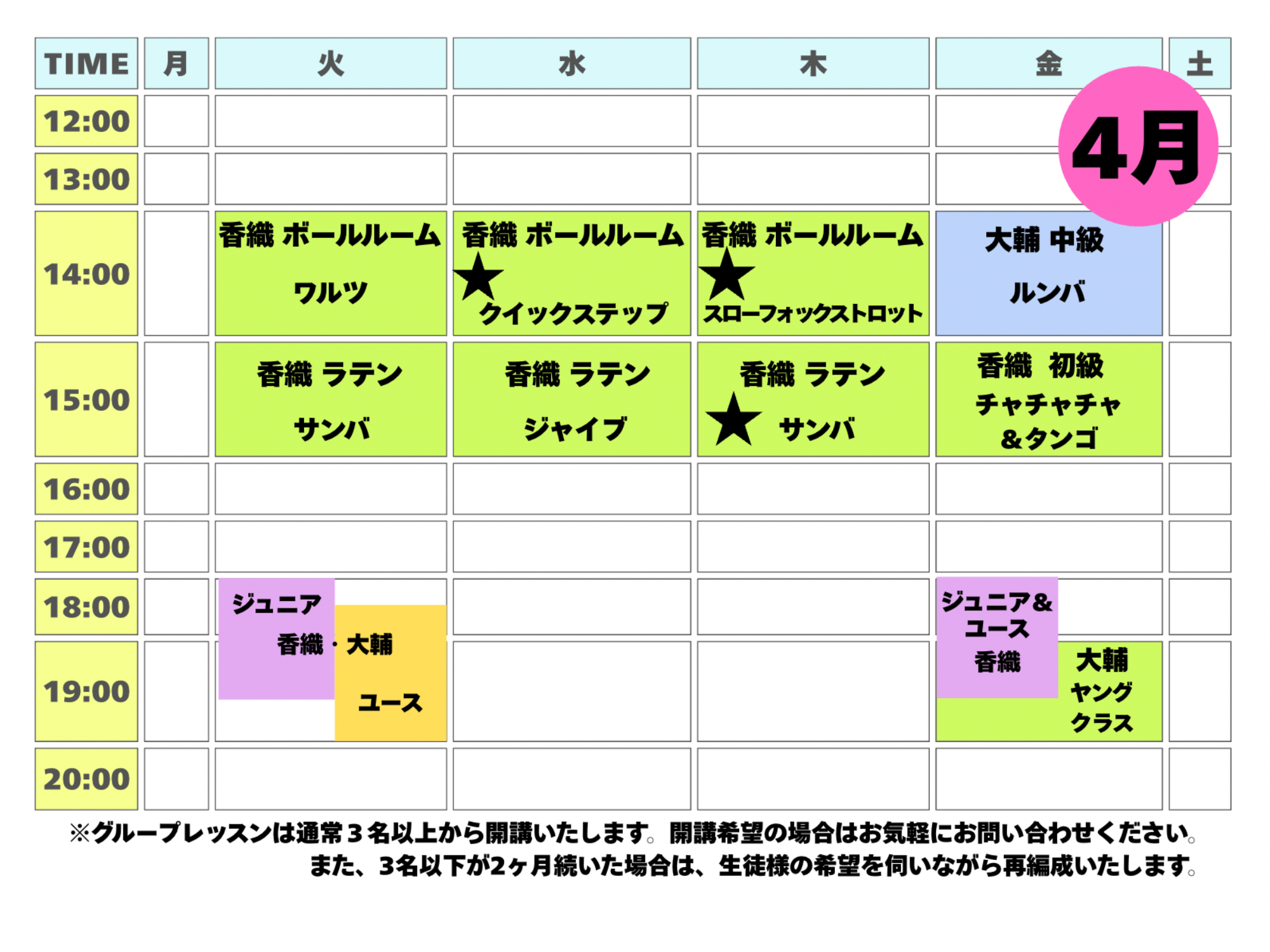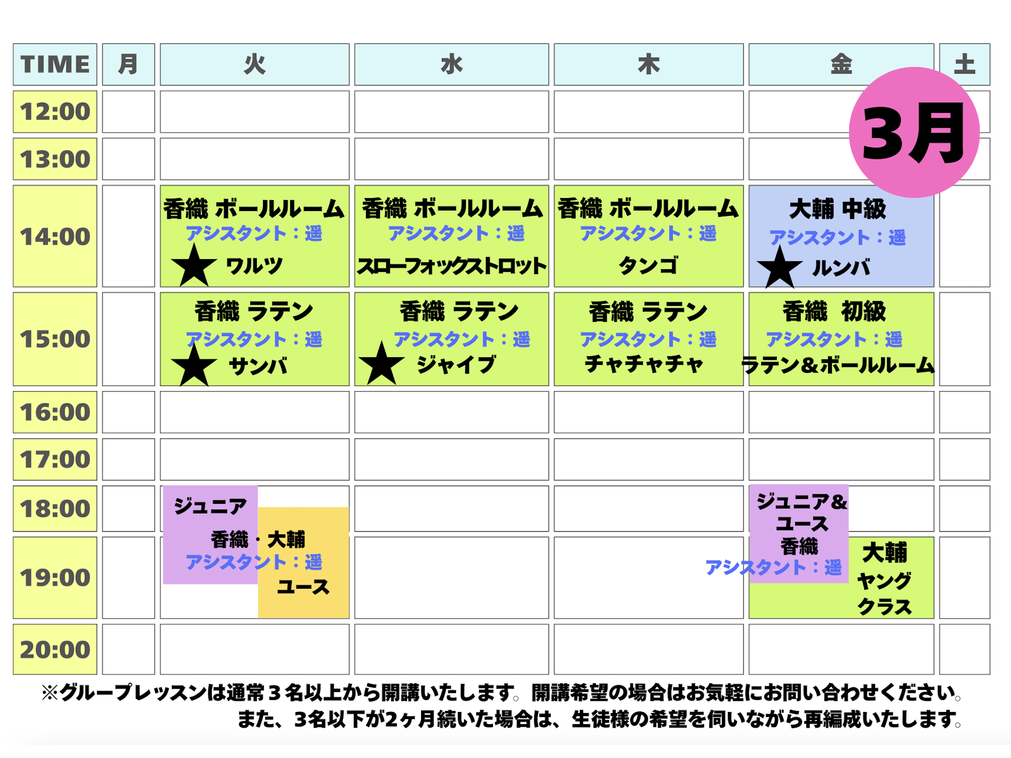 | プライベートレッスン カップルレッスン | 講師:大西大輔・大西香織 25分4,800円(税込) 50分8,700円(税込) レッスン時間が自由に選べる予約制です。自分のやりたい事を自分のペースで学べます。グループレッスンと並行して活用するのもオススメです。料金はレッスン毎に現金にてお支払いください。 |