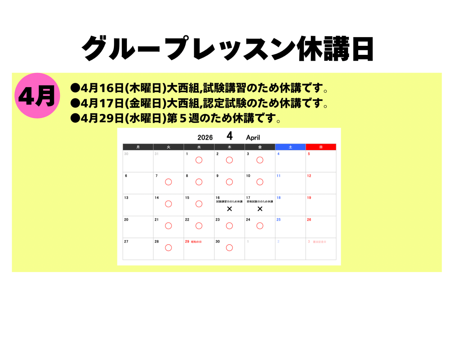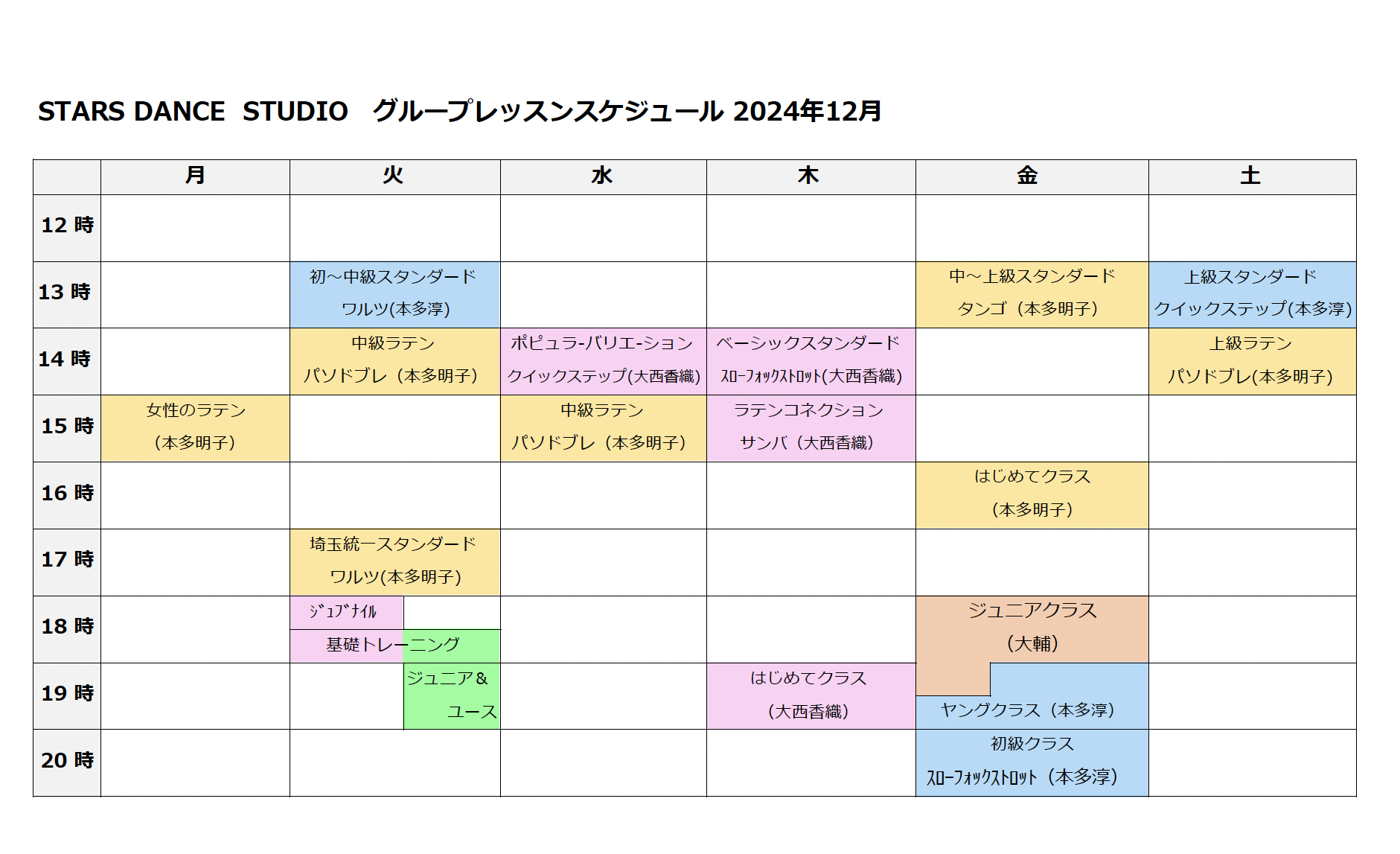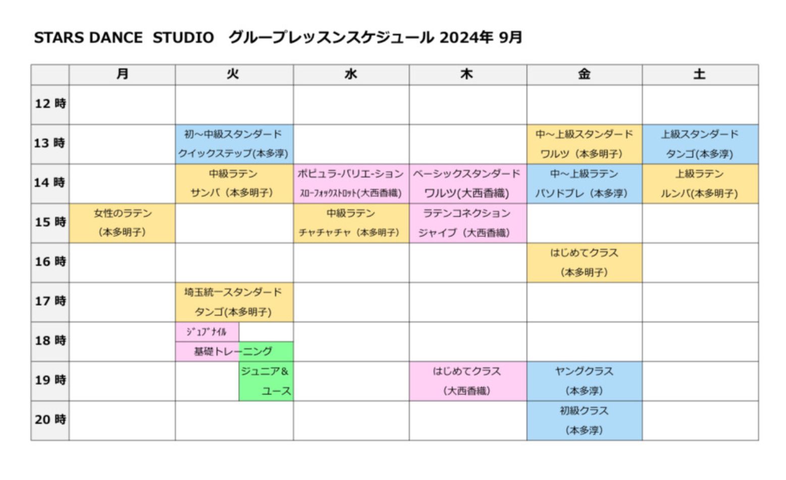 | 学生割引 | 学生の方はプライベートレッスン、カップルレッスン、グループレッスンを通常の半額で受けることができます。 |