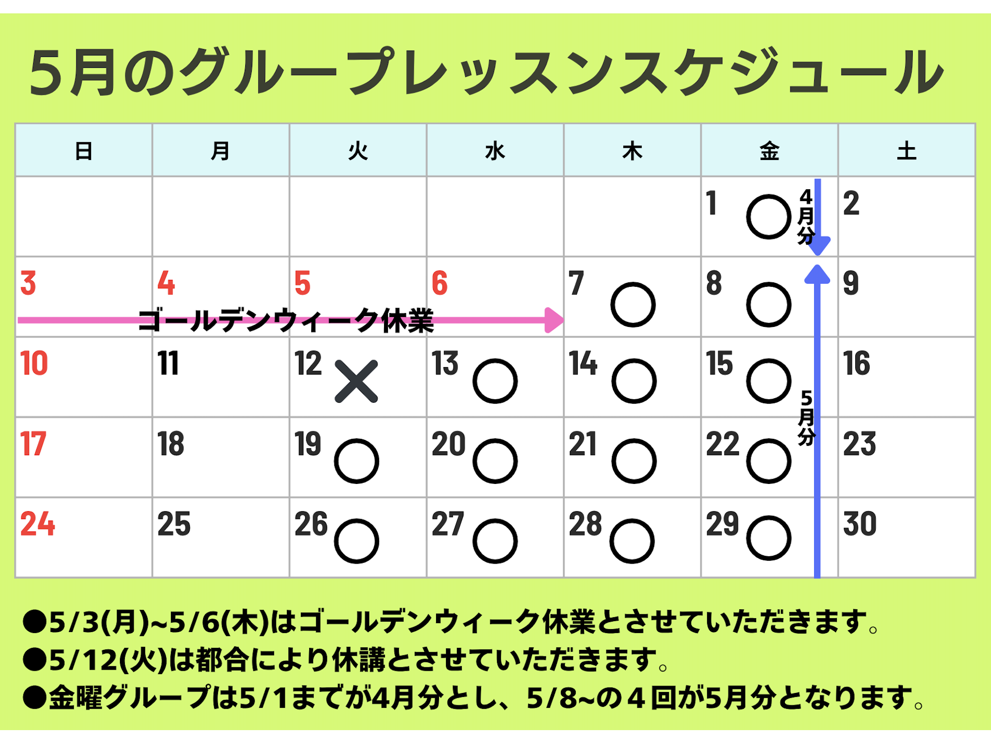 | グループレッスン | ◆50分 4回/月 5,800円(税込) ◆50分 1回 2,200円(税込) 月謝制でリーズナブルな料金で気軽に始められます。お友達と一緒にレッスンを受けたい方にもオススメです。初心者の方から、より深く学びたい上級者の方まで楽しめる様々なクラスを用意しています。 1回から受けることができるので、興味のあるクラスをお試しできます。 |
